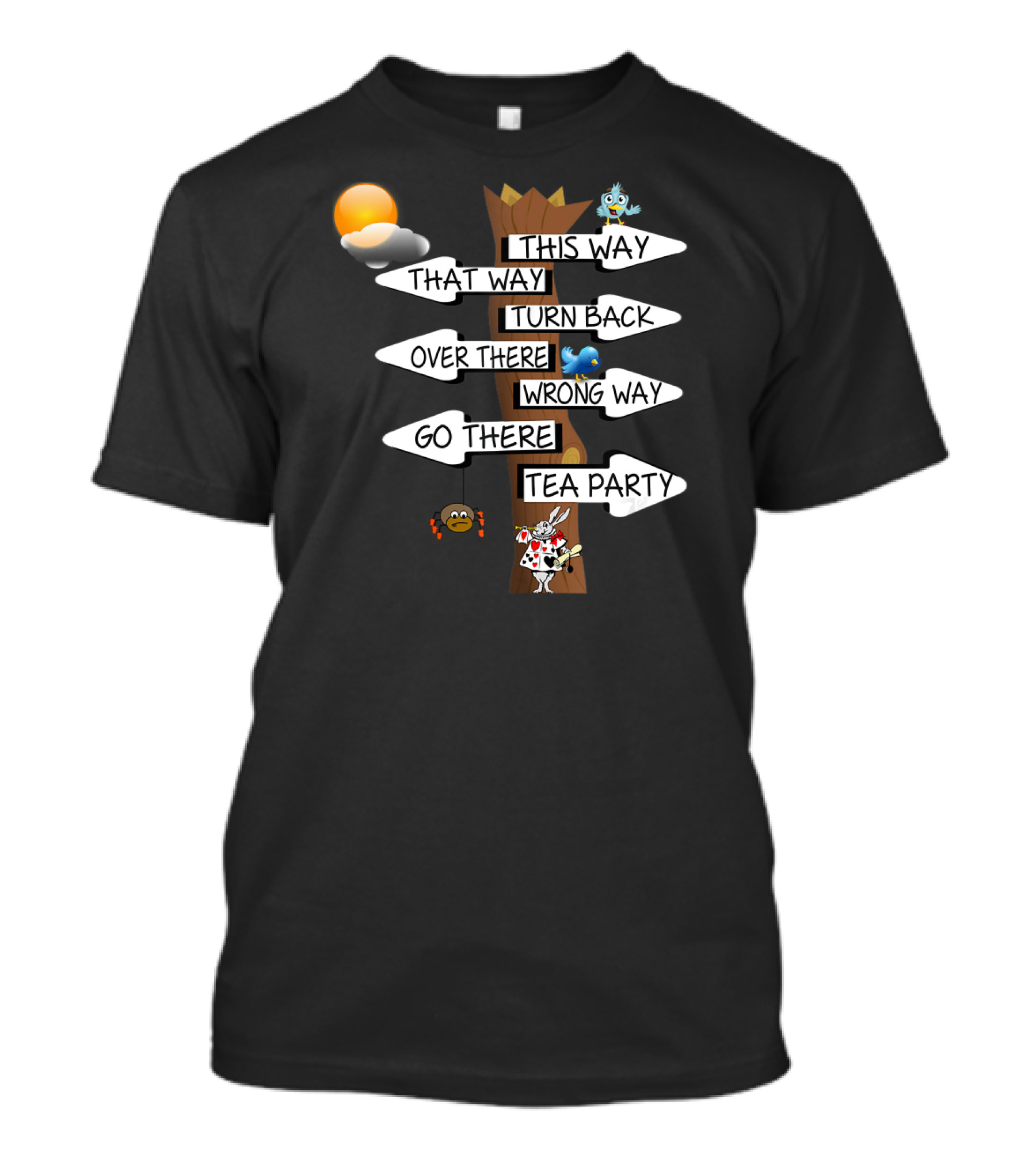 The This Way That Way Turn Back Over There Wrong Way Go There Tea Party Alice in Wonderland White T-shirt is designed for everyday wear and a consistent fit. Fabric is pre-shrunk ring-spun cotton with durable stitching. See the size chart below for exact measurements.