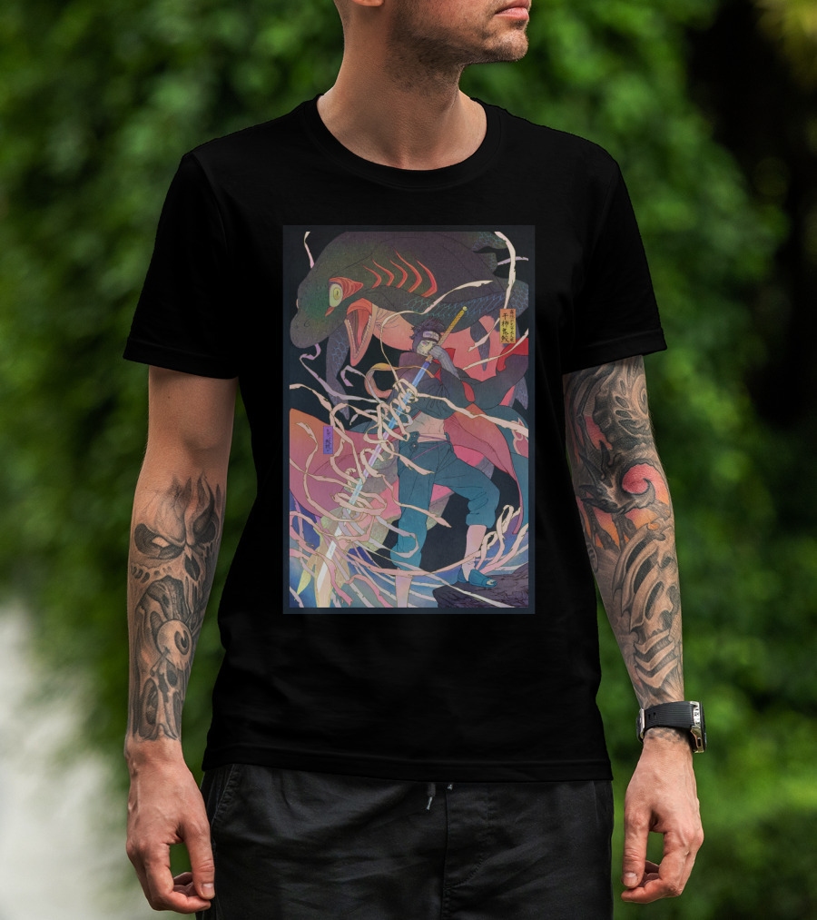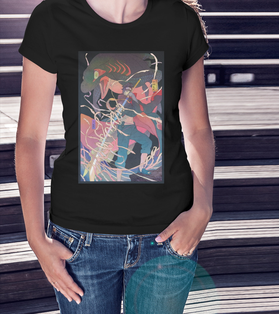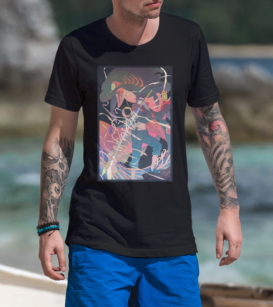 The Kisame Sword Wielding Character with Giant Shark and Energy Swirls T-shirt is designed for everyday wear and a consistent fit. Fabric is pre-shrunk ring-spun cotton with durable stitching. See the size chart below for exact measurements.