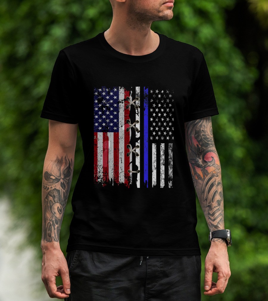 The American Flag Thin Blue Line Split T-shirt is designed for everyday wear and a consistent fit. Fabric is pre-shrunk ring-spun cotton with durable stitching. See the size chart below for exact measurements.