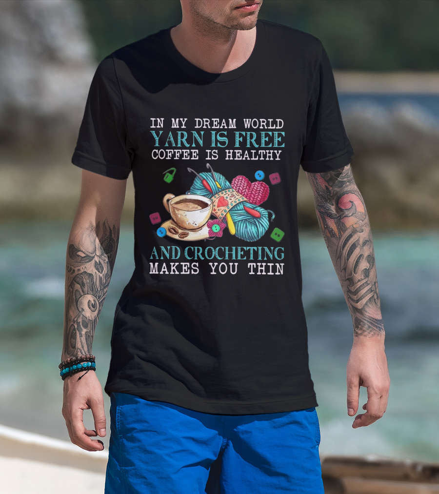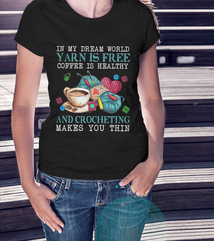 In My Dream World Yarn Is Free Coffee Is Healthy Crocheting Makes You Thin Cup Of Coffee And Yarn With Crochet Accessories T-Shirt