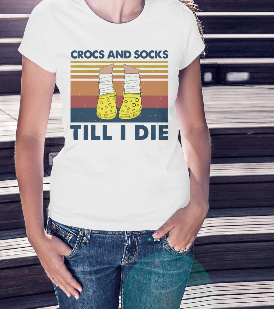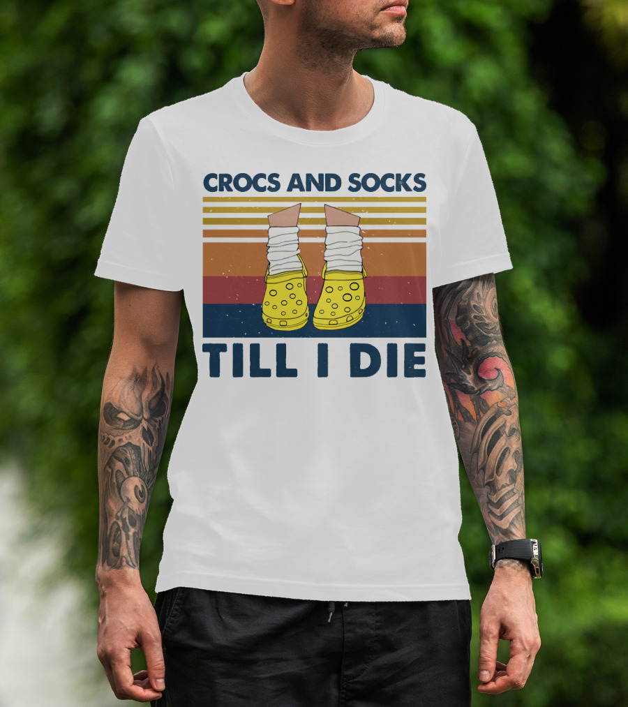 Crocs And Socks Till I Die Yellow Footwear Retro Stripes T-Shirt