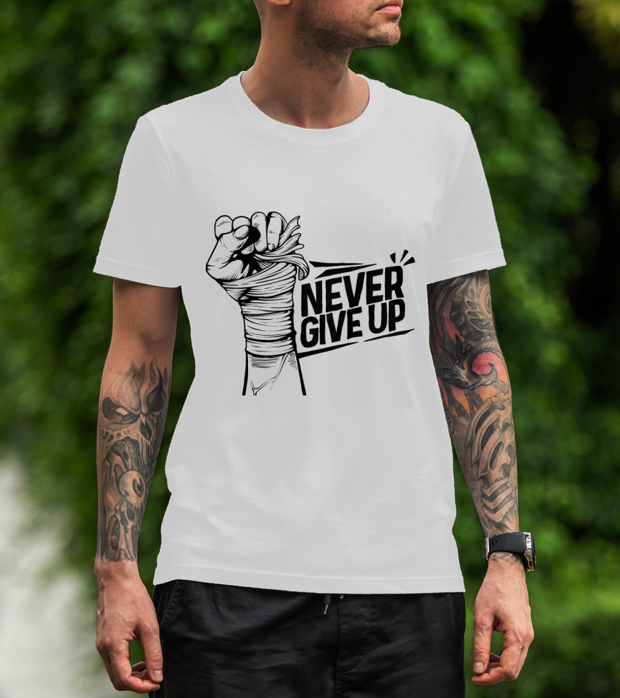 NEVER GIVE UP Fist Wrapped In Bandages Motivational Strength T-Shirt