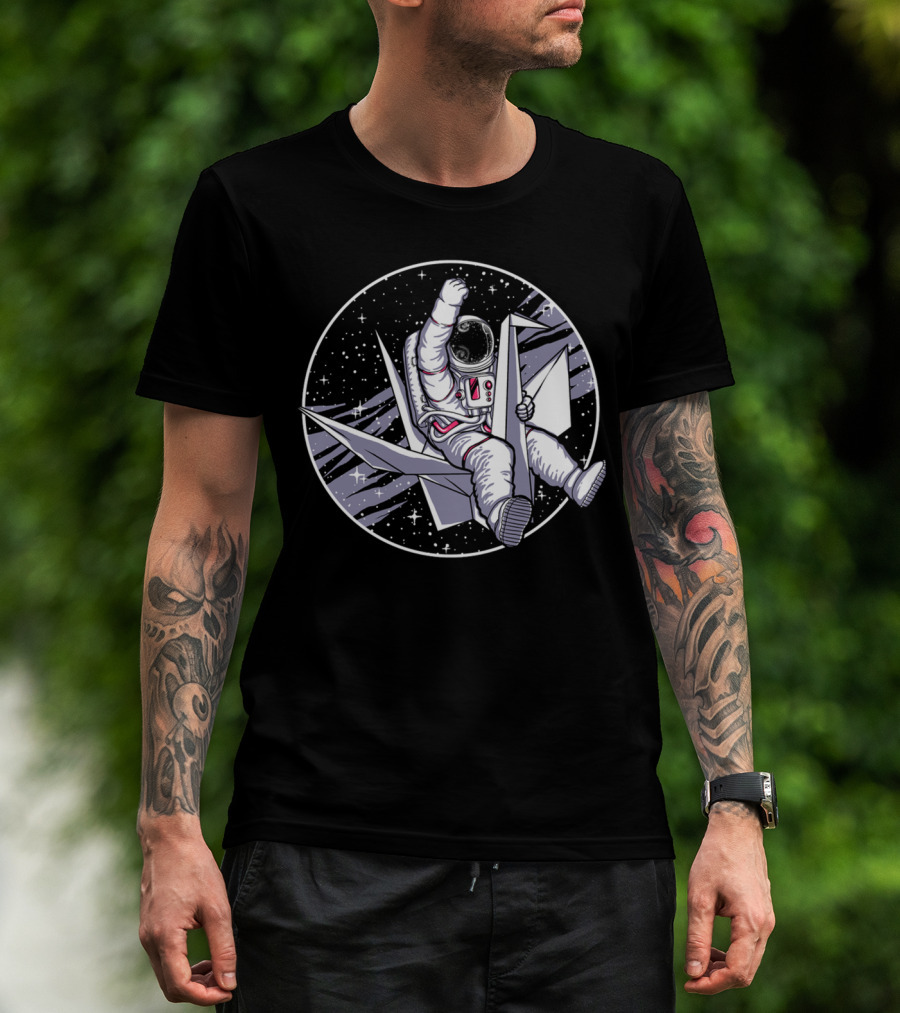 Astronaut Riding Origami Crane In Space Scene T-Shirt