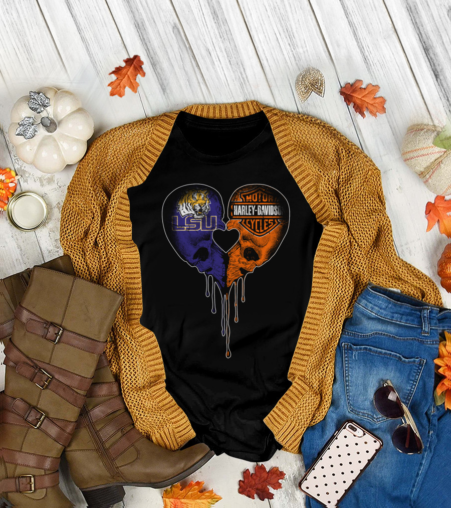 Lsu Tigers And Harley Davidson Heart Skull Fusion T-Shirt