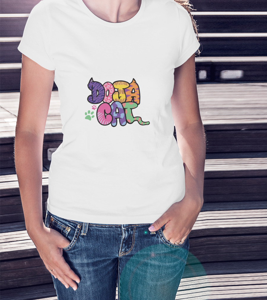 Doja Cat Colorful Patterned Text With Cat Ears And Paw Prints T-Shirt