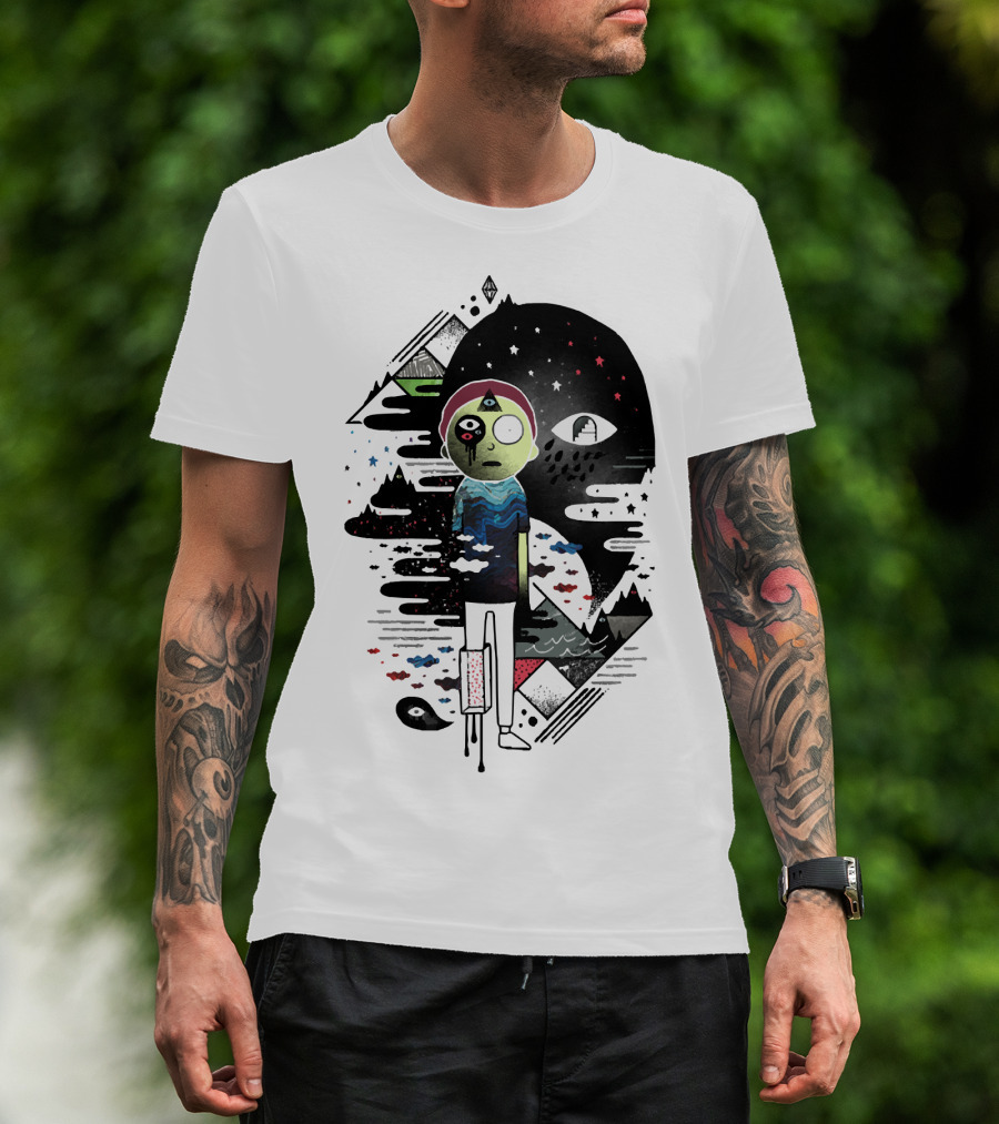 The Inner Dimensional Morty Surreal Cosmic Exploration with Third Eye and Galaxy Elements T-shirt is designed for everyday wear and a consistent fit. Fabric is pre-shrunk ring-spun cotton with durable stitching. See the size chart below for exact measurements.