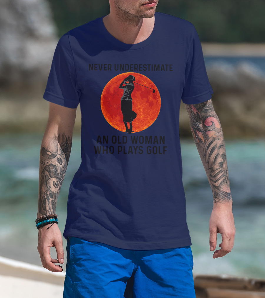 Never Underestimate An Old Woman Who Plays Golf Against Fiery Red Moon T-Shirt