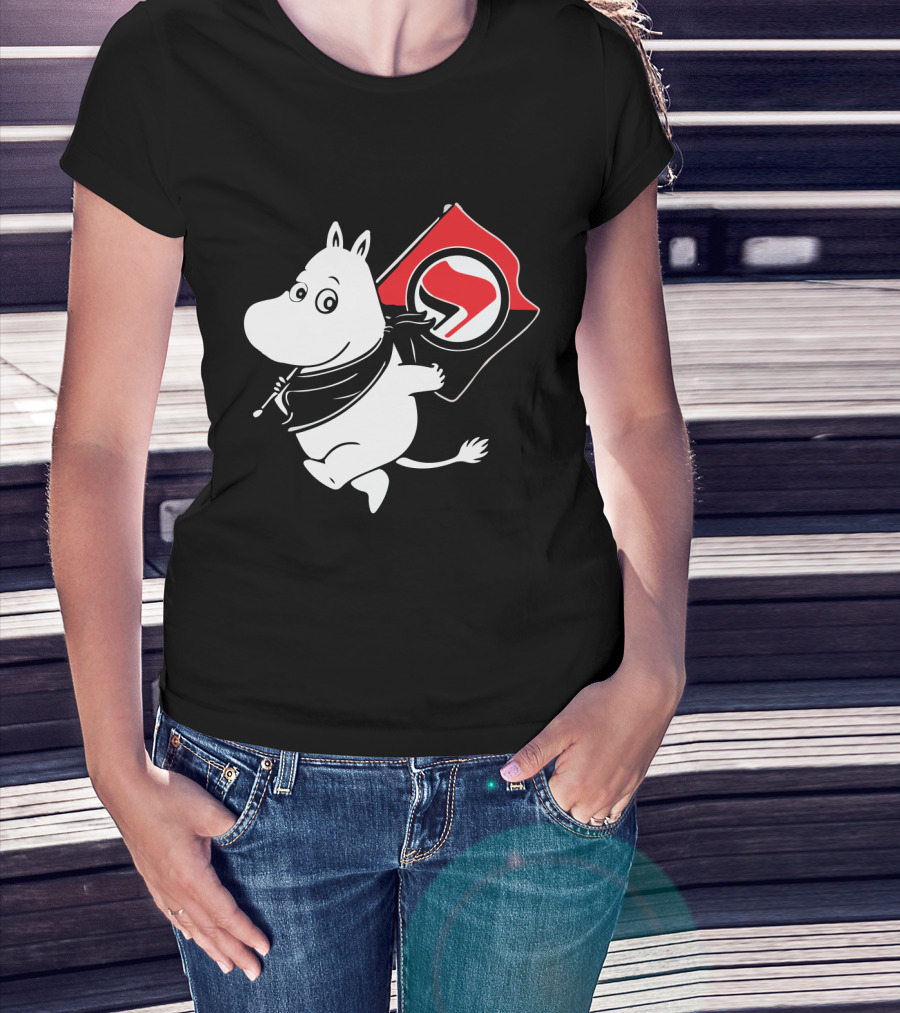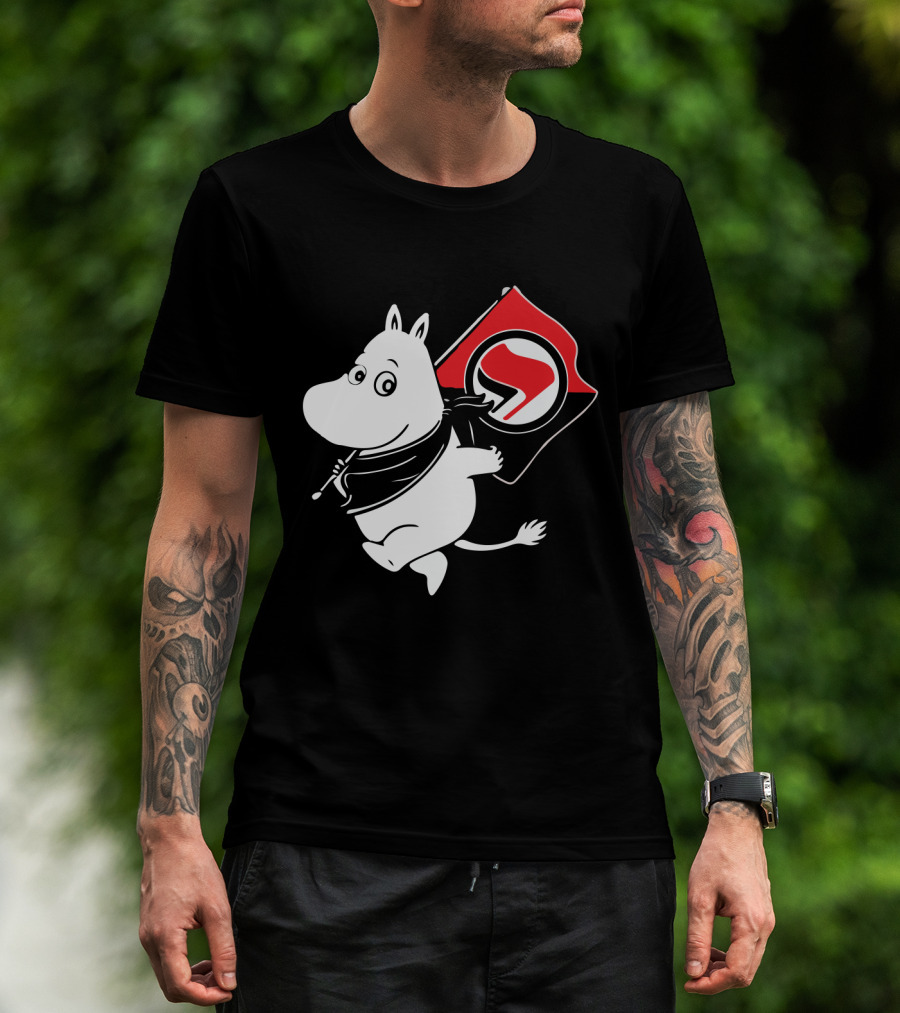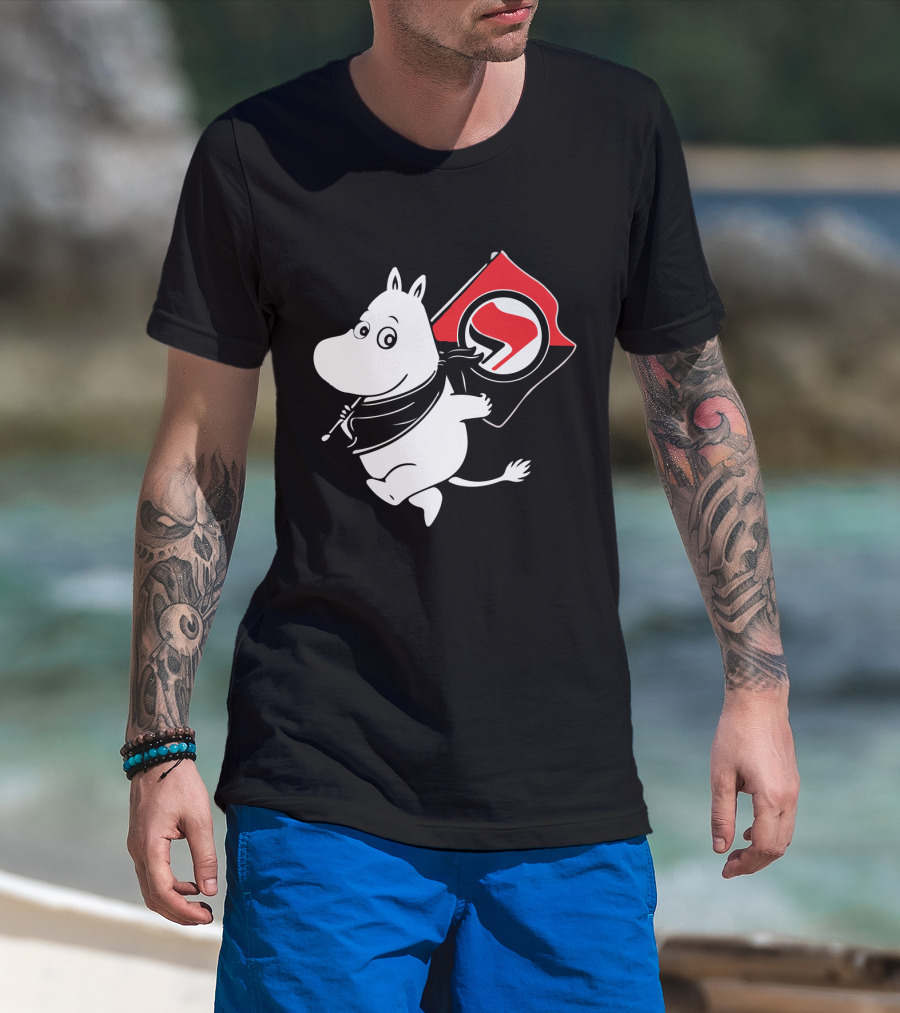 The Moomin Holding Antifa Flag T-shirt is designed for everyday wear and a consistent fit. Fabric is pre-shrunk ring-spun cotton with durable stitching. See the size chart below for exact measurements.