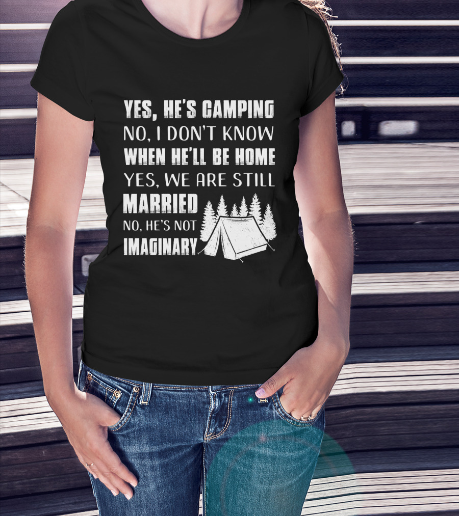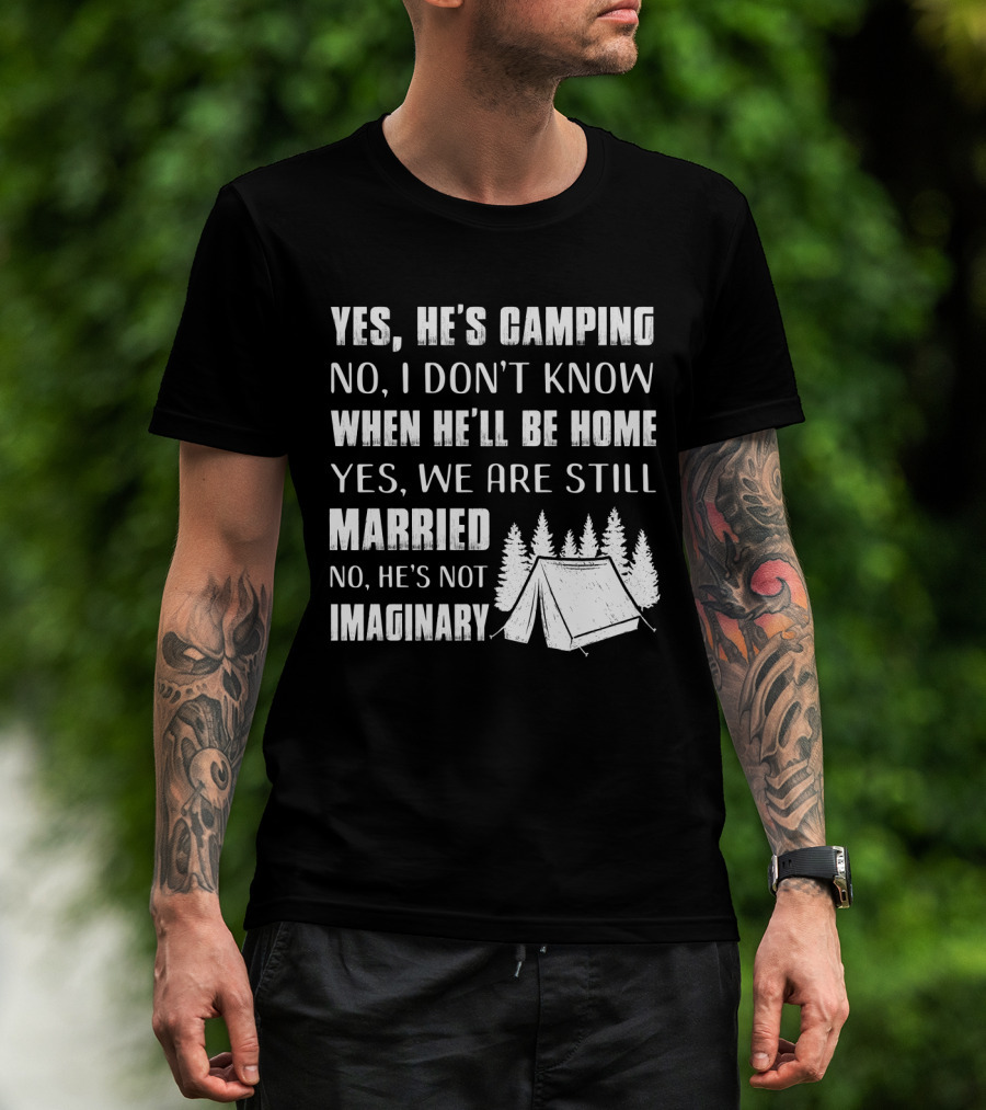 Yes He's Camping No I Don't Know When He'll Be Home Yes We Are Still Married No He's Not Imaginary Camping Tent And Trees T-Shirt