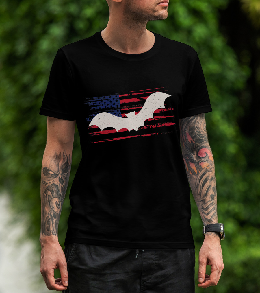 The Bat Silhouette with US American Flag Background T-shirt is designed for everyday wear and a consistent fit. Fabric is pre-shrunk ring-spun cotton with durable stitching. See the size chart below for exact measurements.
