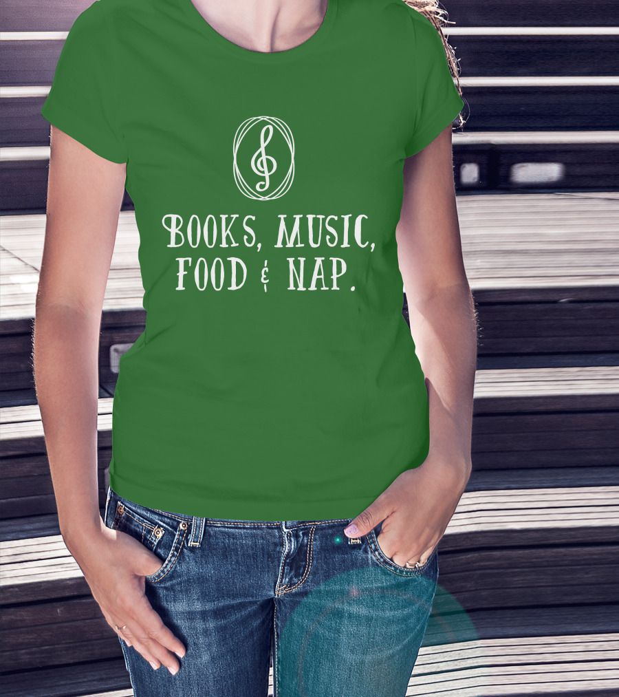 The Books Music Food and Nap T-shirt is designed for everyday wear and a consistent fit. Fabric is pre-shrunk ring-spun cotton with durable stitching. See the size chart below for exact measurements.