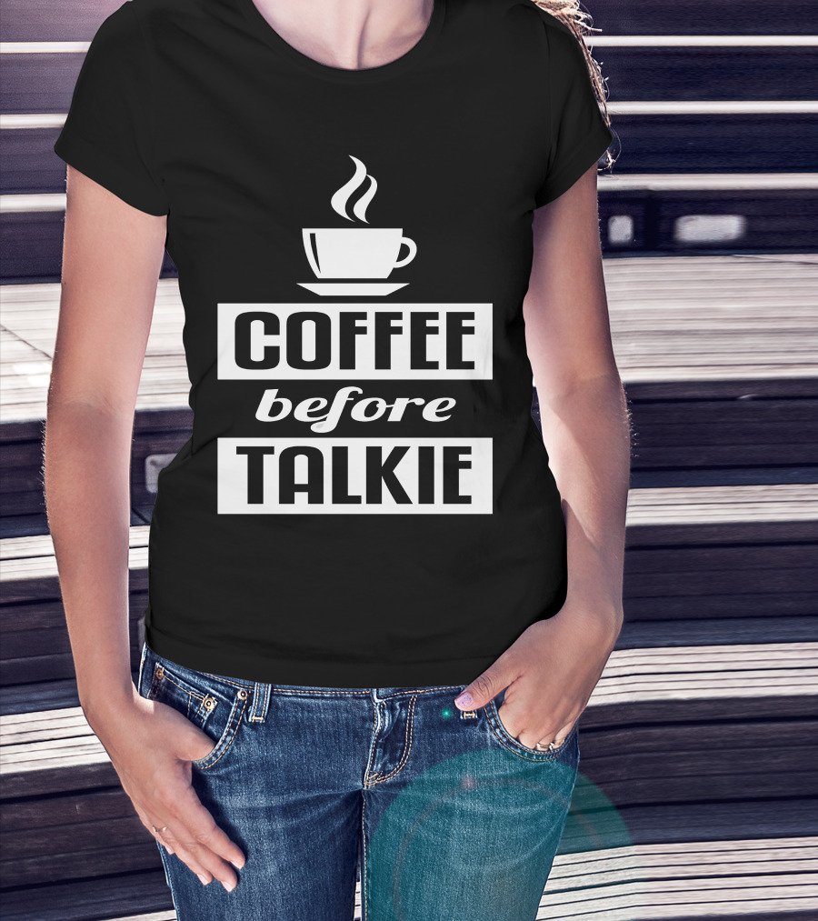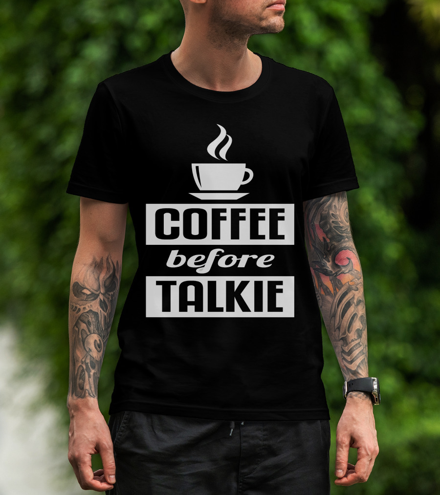 The Coffee Before Talkie Steaming Cup T-shirt is designed for everyday wear and a consistent fit. Fabric is pre-shrunk ring-spun cotton with durable stitching. See the size chart below for exact measurements.