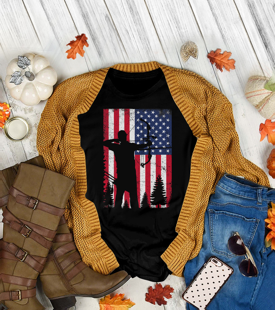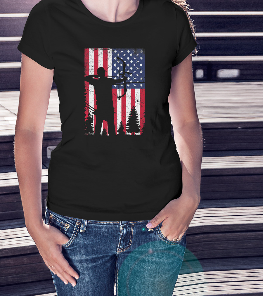 American Archery Bow Hunting Bow Hunter Silhouette USA Flag Background T-Shirt