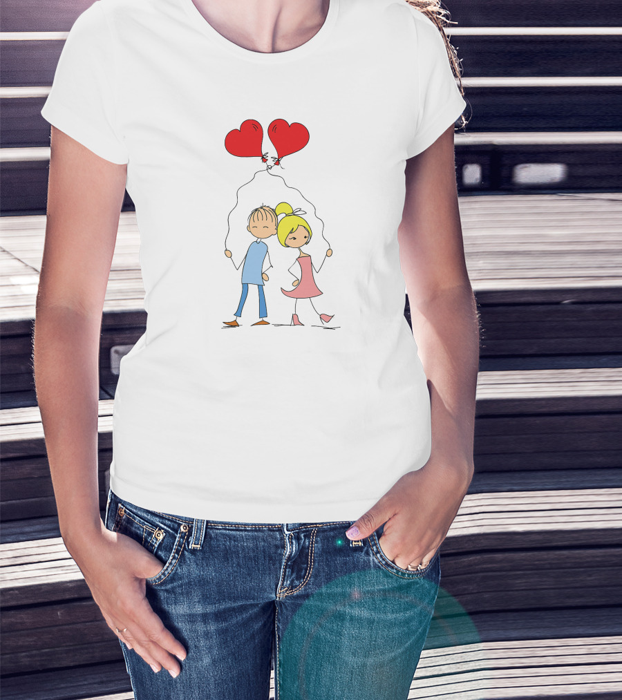 The Couple with Heart-Shaped Balloons T-shirt is designed for everyday wear and a consistent fit. Fabric is pre-shrunk ring-spun cotton with durable stitching. See the size chart below for exact measurements.
