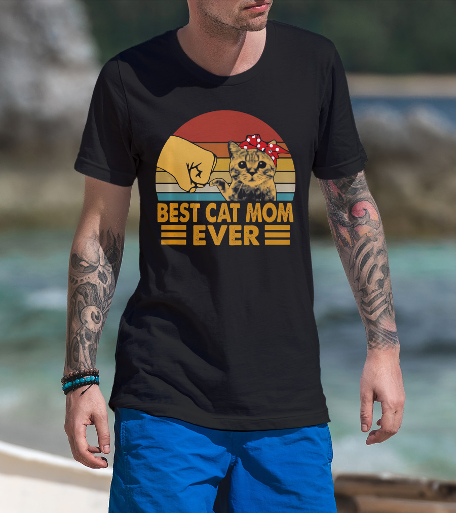 Best Cat Mom Ever Vintage Be Fist Bump Cat With Bow Retro Stripes T-Shirt