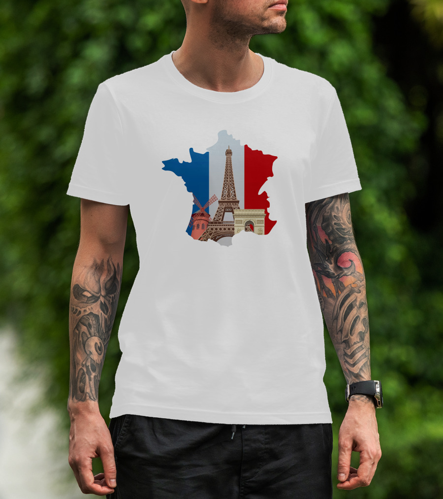 The France Map with Eiffel Tower and Moulin Rouge on Tricolor Flag T-shirt is designed for everyday wear and a consistent fit. Fabric is pre-shrunk ring-spun cotton with durable stitching. See the size chart below for exact measurements.
