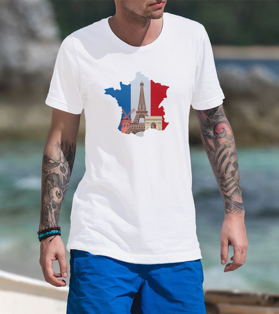 France Map With Eiffel Tower And Moulin Rouge On Tricolor Flag T-Shirt