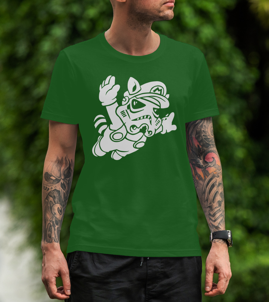 The Tanooki Trooper Mashup M Helmet Raccoon Tail T-shirt is designed for everyday wear and a consistent fit. Fabric is pre-shrunk ring-spun cotton with durable stitching. See the size chart below for exact measurements.