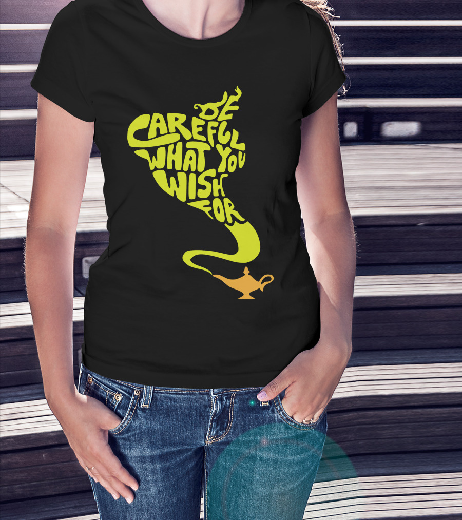 The Be Careful What You Wish For Genie Lamp T-shirt is designed for everyday wear and a consistent fit. Fabric is pre-shrunk ring-spun cotton with durable stitching. See the size chart below for exact measurements.