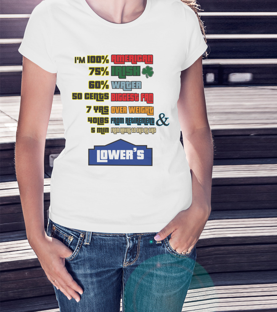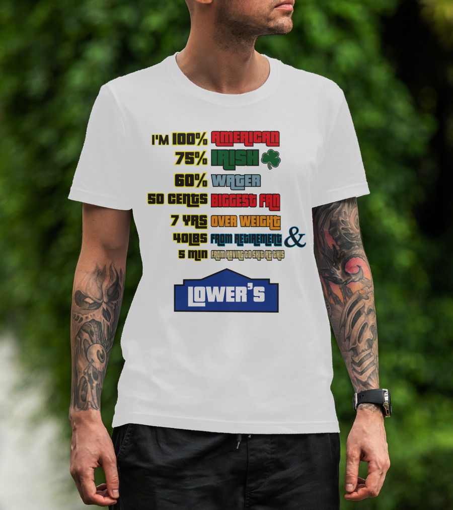 The I'm 100% American 75% Irish Shamrock 60% Water 50 Cents Biggest Fan 7 Yrs Over Weight 40lbs From Retirement and 5 Min From Having To Ship At This LOWER'S T-shirt is designed for everyday wear and a consistent fit. Fabric is pre-shrunk ring-spun cotton with durable stitching. See the size chart below for exact measurements.