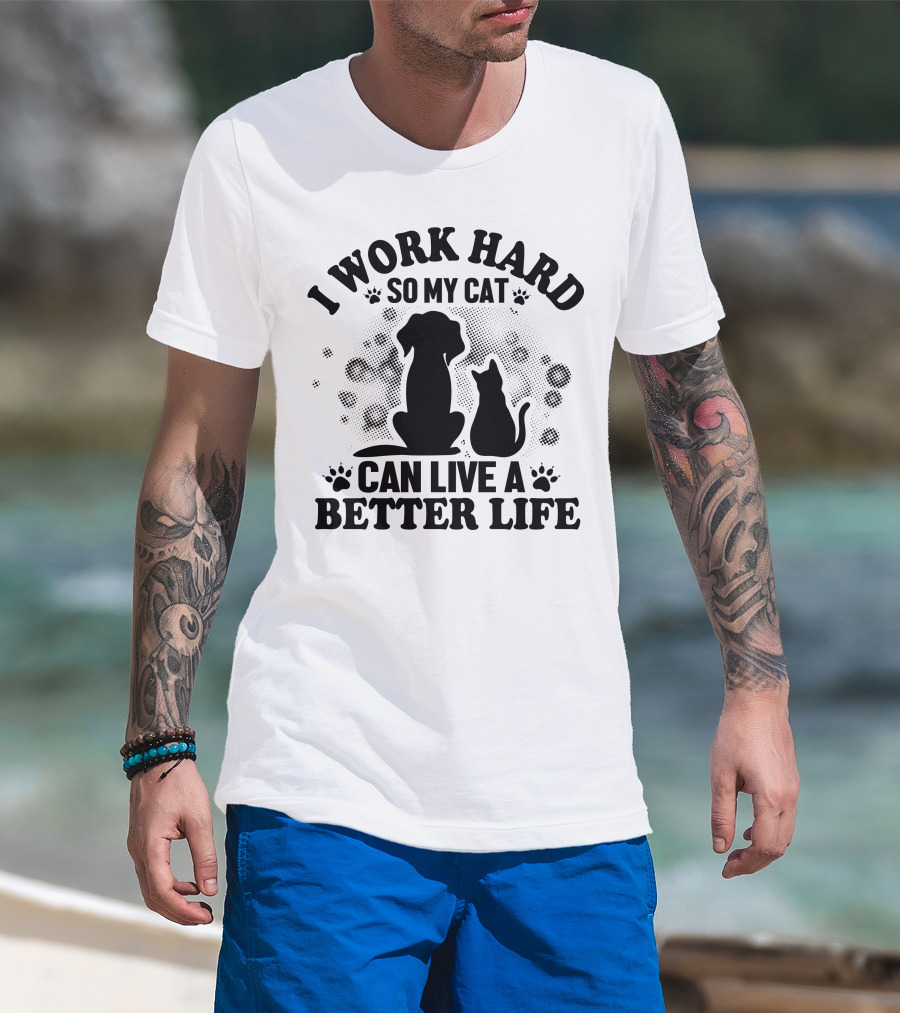 The I Work Hard So My Cat Can Live a Better Life Dog Cat Paw Prints Bubbles T-shirt is designed for everyday wear and a consistent fit. Fabric is pre-shrunk ring-spun cotton with durable stitching. See the size chart below for exact measurements.