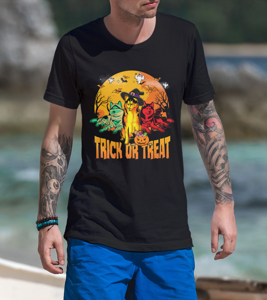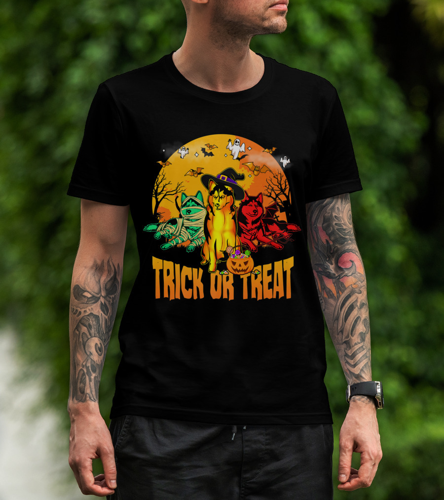 Trick Or Treat Siberian Husky Halloween Ghosts Pumpkins And Bats T-Shirt