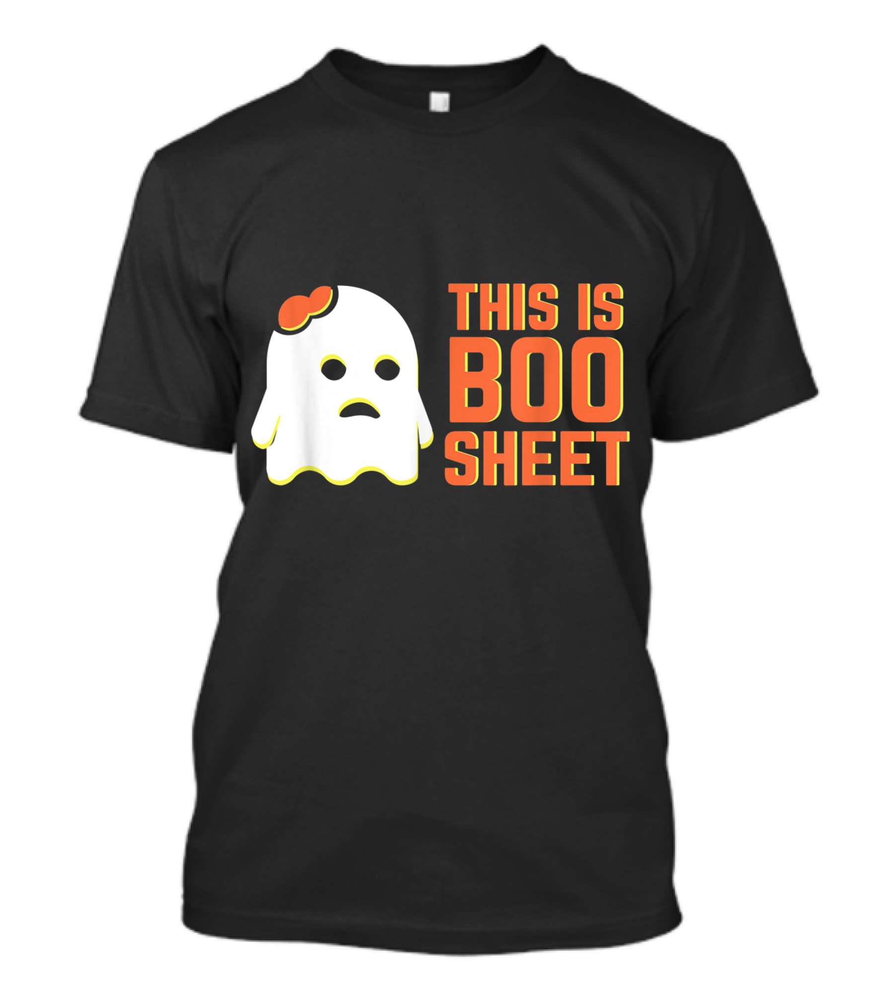 The Halloween Ghost This Is Boo Sheet Graphic with Cute Bow Accent T-shirt is designed for everyday wear and a consistent fit. Fabric is pre-shrunk ring-spun cotton with durable stitching. See the size chart below for exact measurements.