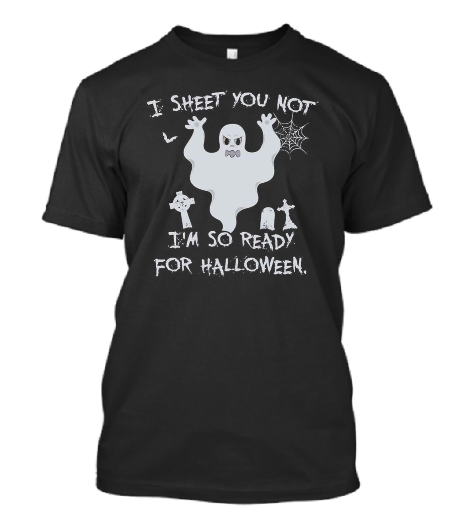 The I Sheet You Not I'm So Ready for Halloween Ghost and Gravestones T-shirt is designed for everyday wear and a consistent fit. Fabric is pre-shrunk ring-spun cotton with durable stitching. See the size chart below for exact measurements.