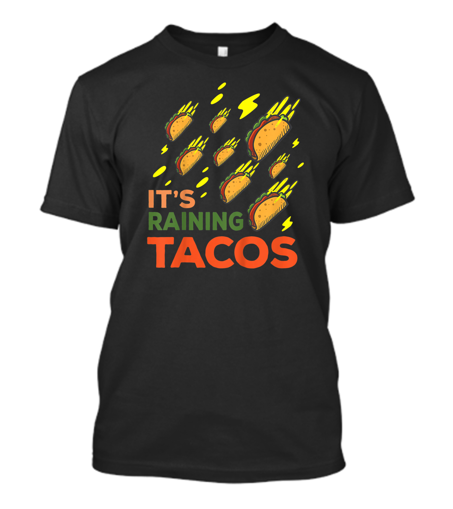 The It's Raining Tacos Surreal Fun Food Drops with Lightning and Colorful Accents T-shirt is designed for everyday wear and a consistent fit. Fabric is pre-shrunk ring-spun cotton with durable stitching. See the size chart below for exact measurements.