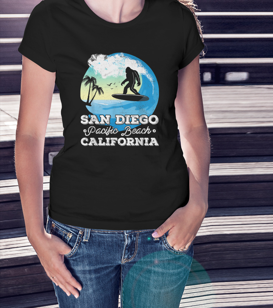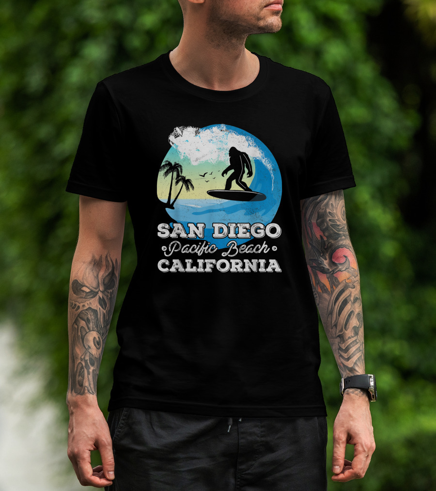 San Diego Pacific Beach California Bigfoot Surfer Adventure Scene T-Shirt