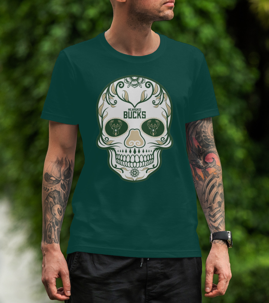 Milwaukee Bucks Skull Deer Logo Floral T-Shirt