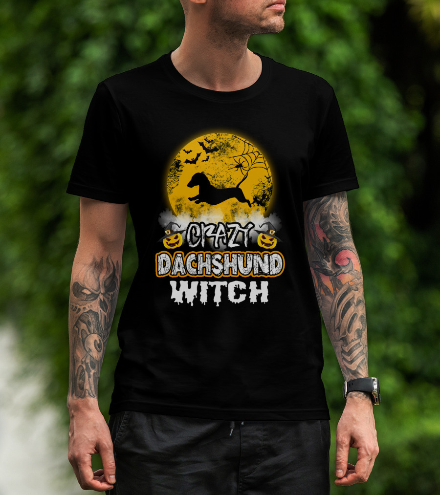 Crazy Dachshund Witch Moon Bats Pumpkin T-Shirt