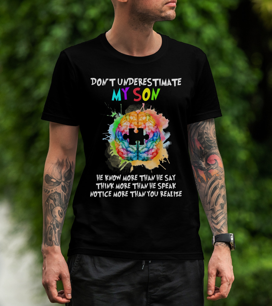 The DON'T UNDERESTIMATE MY SON AUTISM HE KNOW MORE THAN HE SAY THINK MORE THAN HE SPEAK NOTICE MORE THAN YOU REALIZE T-shirt is designed for everyday wear and a consistent fit. Fabric is pre-shrunk ring-spun cotton with durable stitching. See the size chart below for exact measurements.