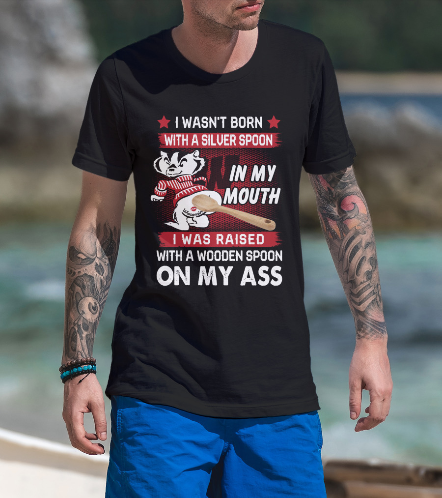 I Wasn't Born With A Silver Spoon In My Mouth Wisconsin Bucky Badger I Was Raised With A Wooden Spoon On My Ass T-Shirt