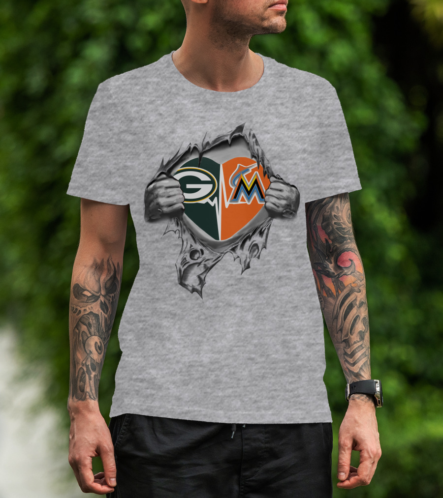 Green Bay Packers Miami Marlins Heart Rip T-Shirt