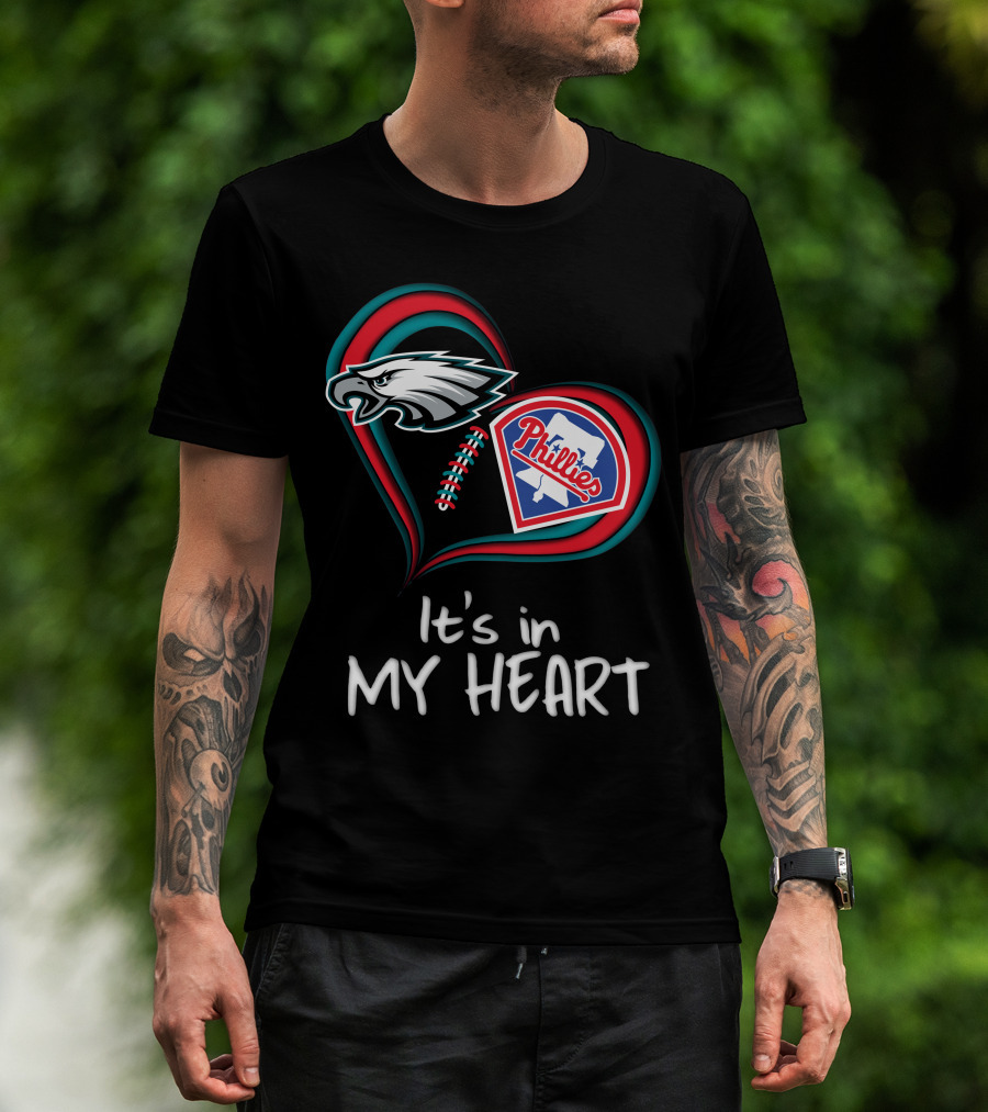 The Eagles Phillies It's In My Heart T-shirt is designed for everyday wear and a consistent fit. Fabric is pre-shrunk ring-spun cotton with durable stitching. See the size chart below for exact measurements.