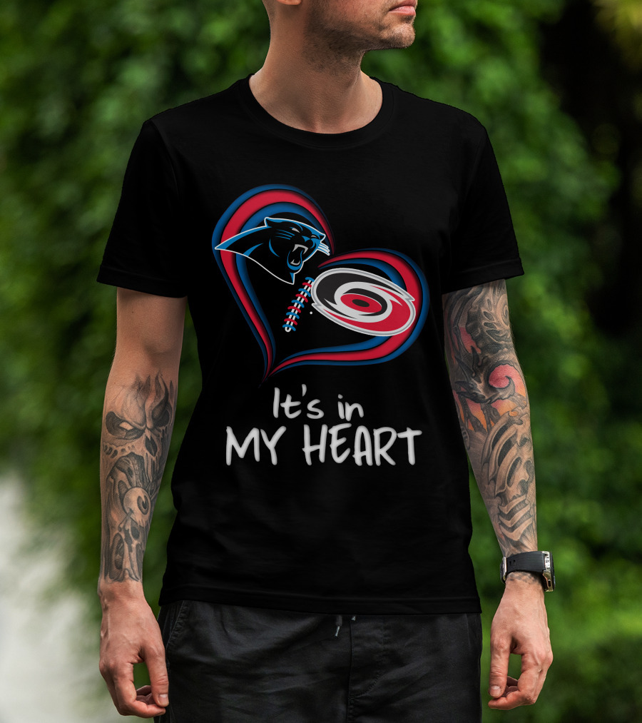 The Panthers Hurricanes It's in My Heart T-shirt is designed for everyday wear and a consistent fit. Fabric is pre-shrunk ring-spun cotton with durable stitching. See the size chart below for exact measurements.