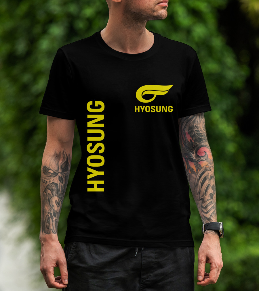The HYOSUNG Logo Stylized Yellow Text Brand T-shirt is designed for everyday wear and a consistent fit. Fabric is pre-shrunk ring-spun cotton with durable stitching. See the size chart below for exact measurements.