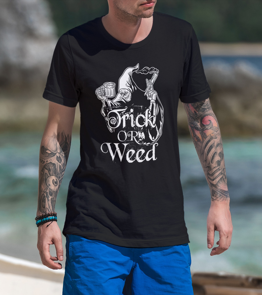 Trick Or Weed Skeleton Grim Reaper Smoking Ganja T-Shirt
