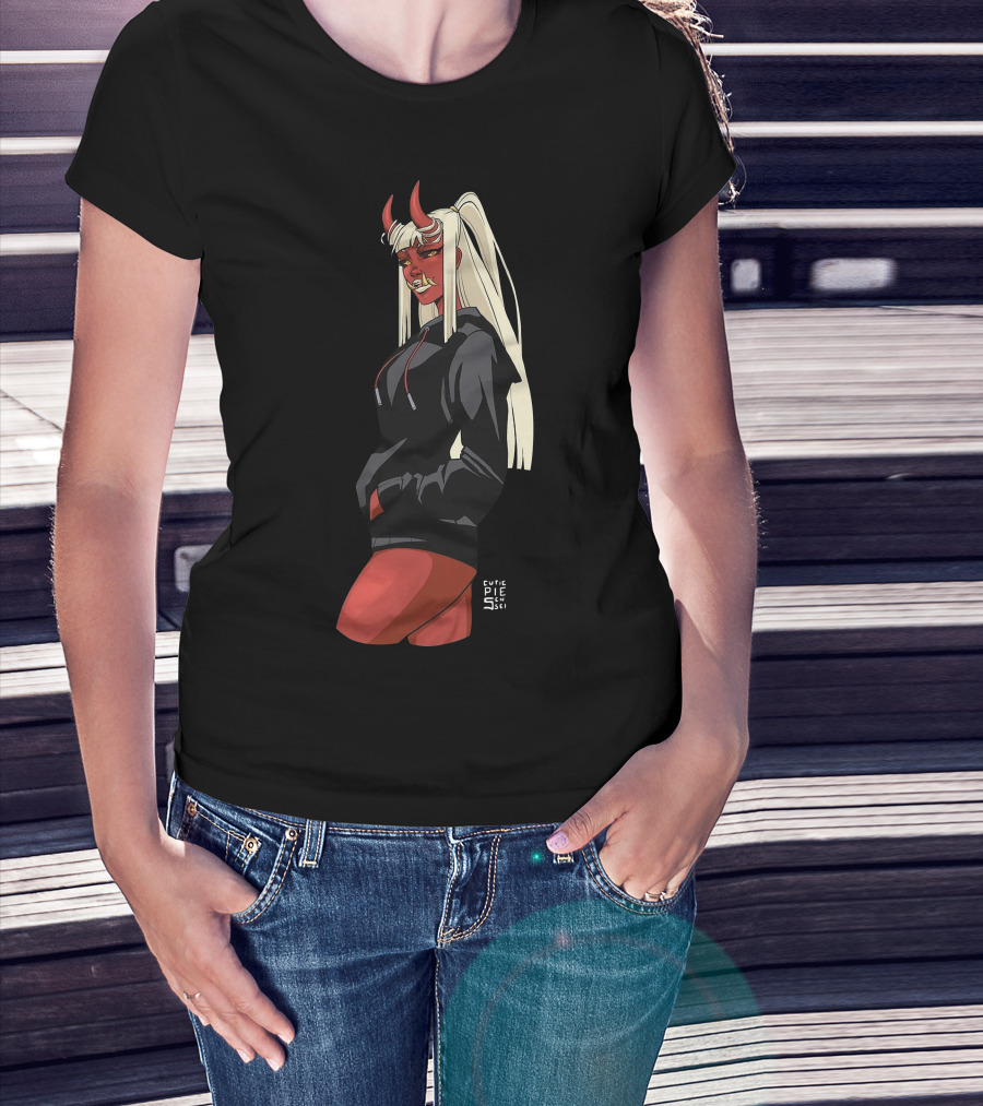 Cutie Pie Sensei X Redpop Oni Chan Demon Girl In Black Hoodie With Red Horns And Long Blonde Hair T-Shirt
