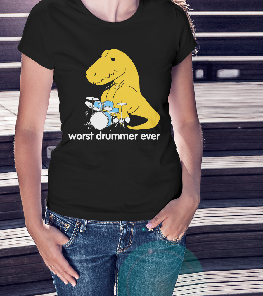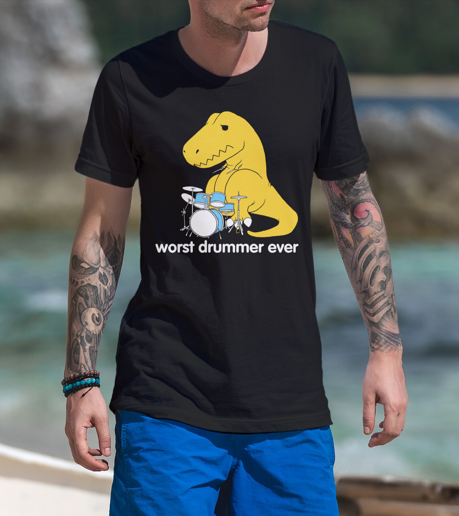 The Worst Drummer Ever T-Rex with Drum Set T-shirt is designed for everyday wear and a consistent fit. Fabric is pre-shrunk ring-spun cotton with durable stitching. See the size chart below for exact measurements.