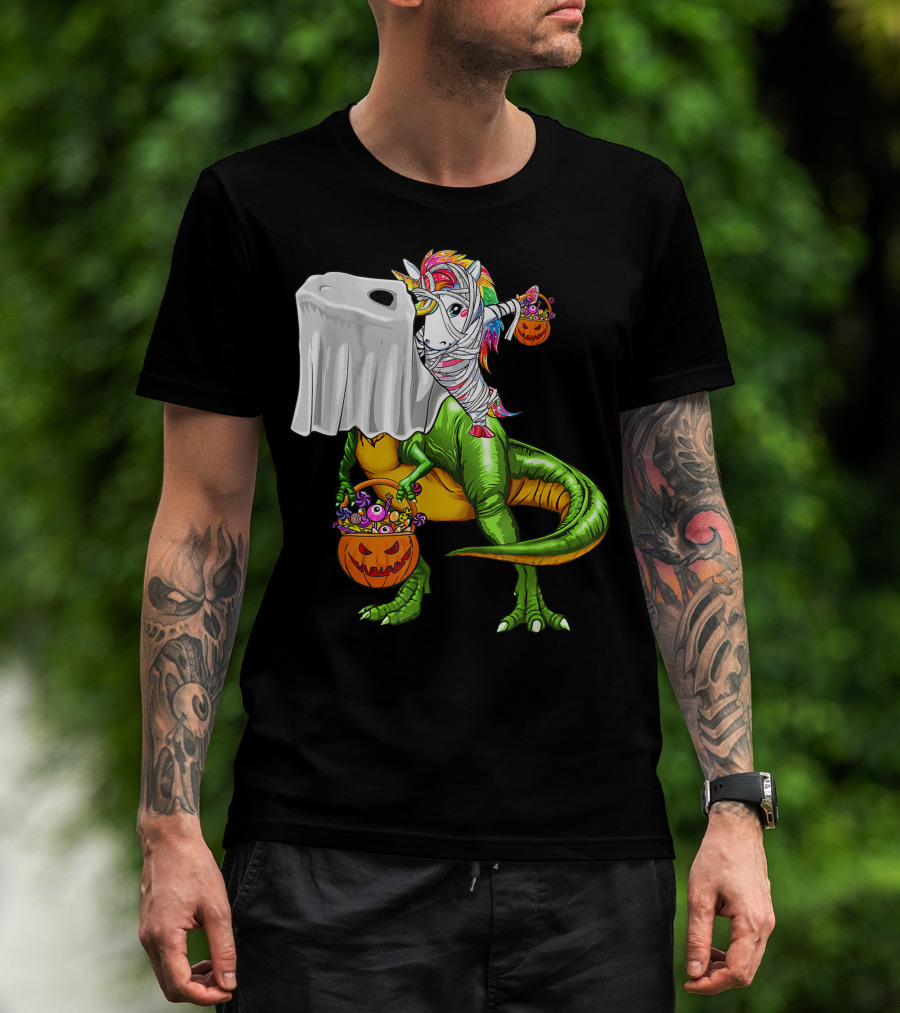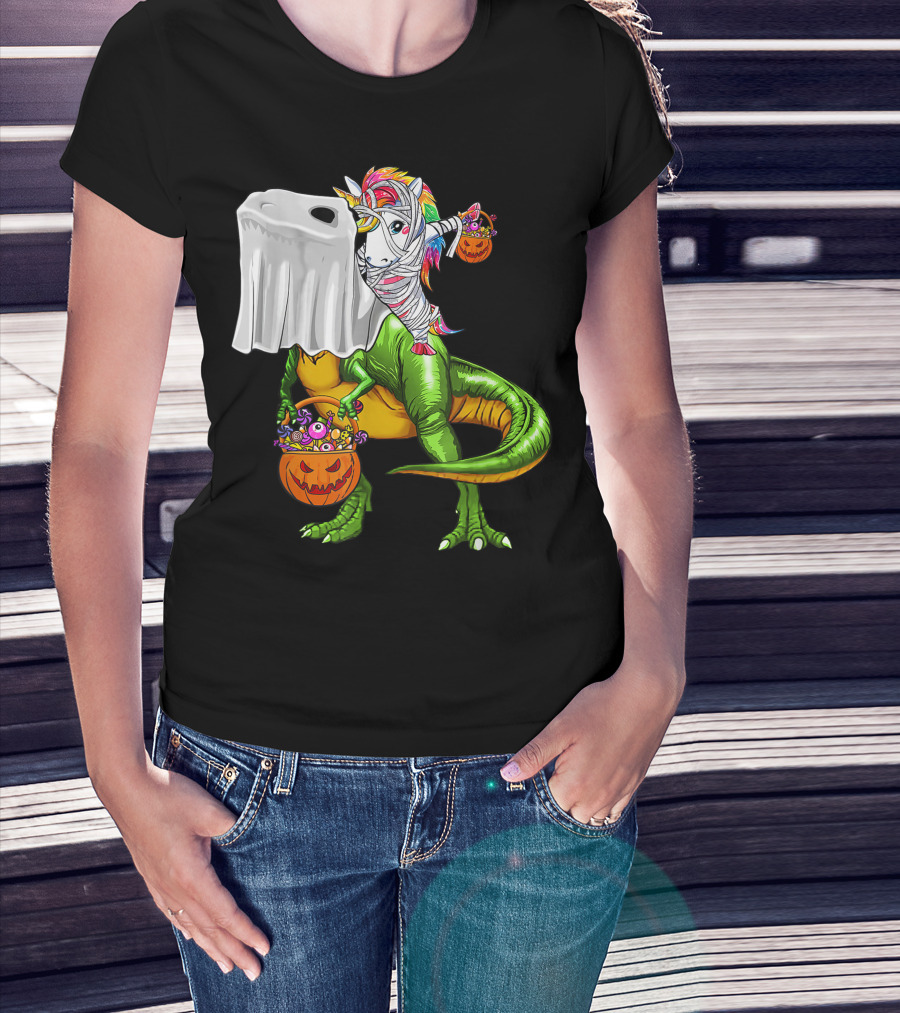 Funny Boo Dinosaur Mummy Unicorn Carrying Pumpkin Halloween T-Shirt