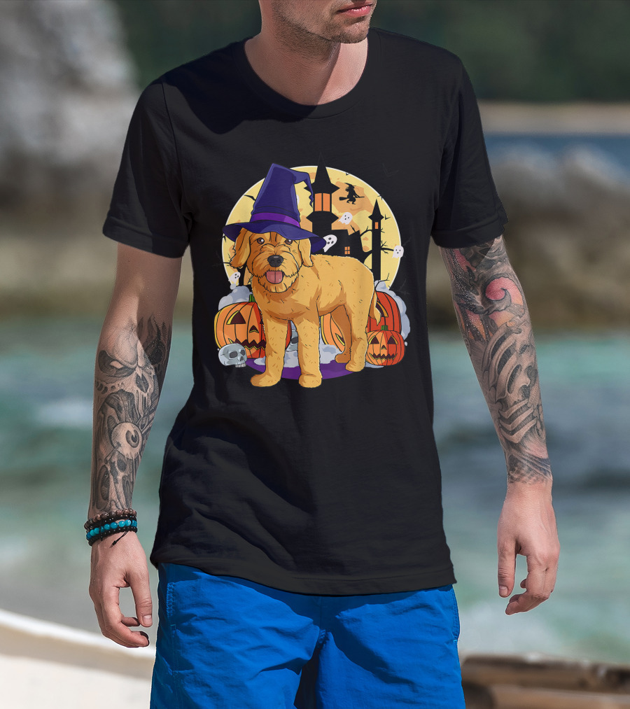 Happy Halloween Goldendoodle Dog Witch Hat Pumpkin Moon Haunted House Ghosts T-Shirt