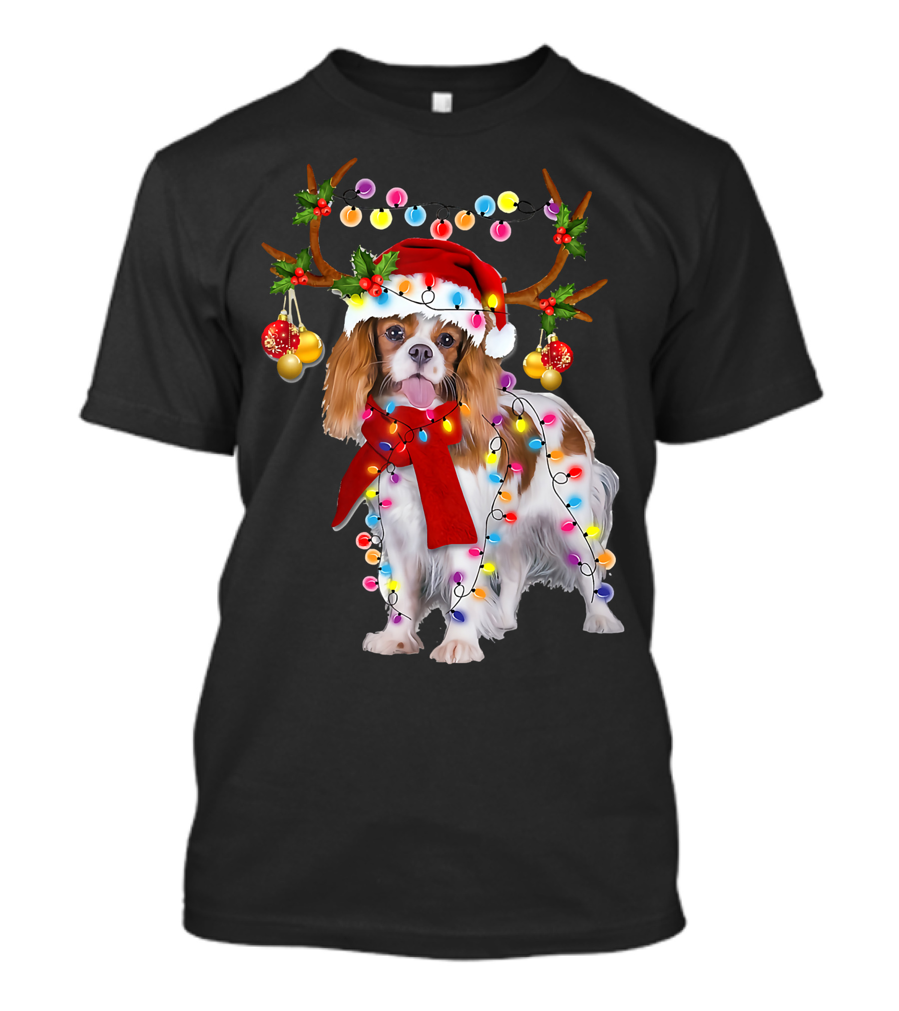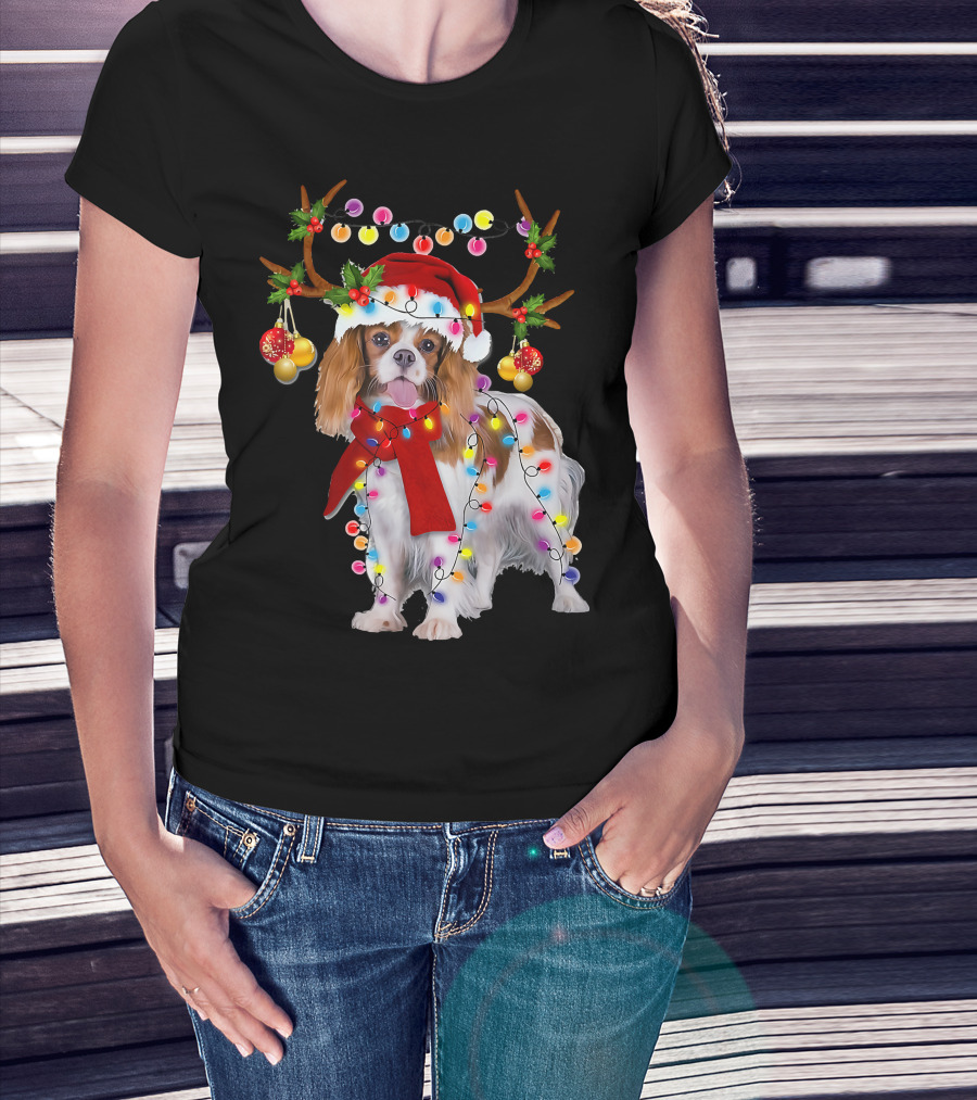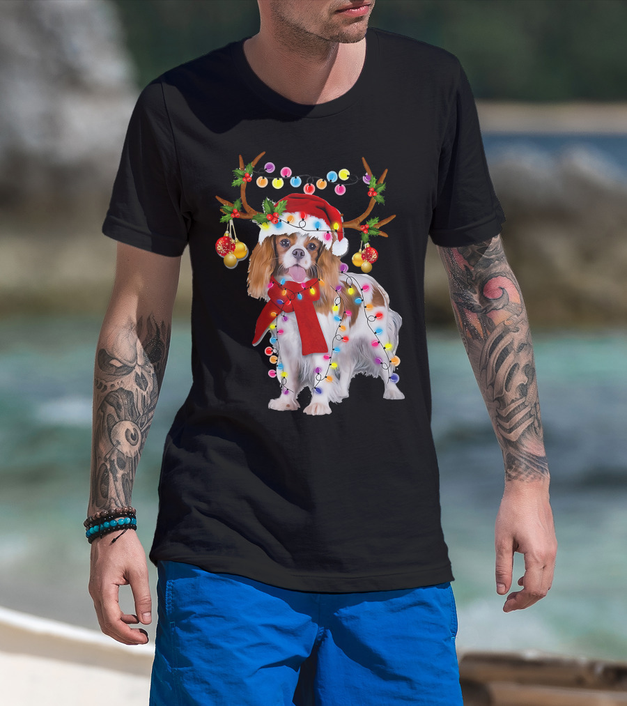 Cavalier King Charles Spaniel With Santa Hat And Reindeer Antlers Christmas Lights T-Shirt