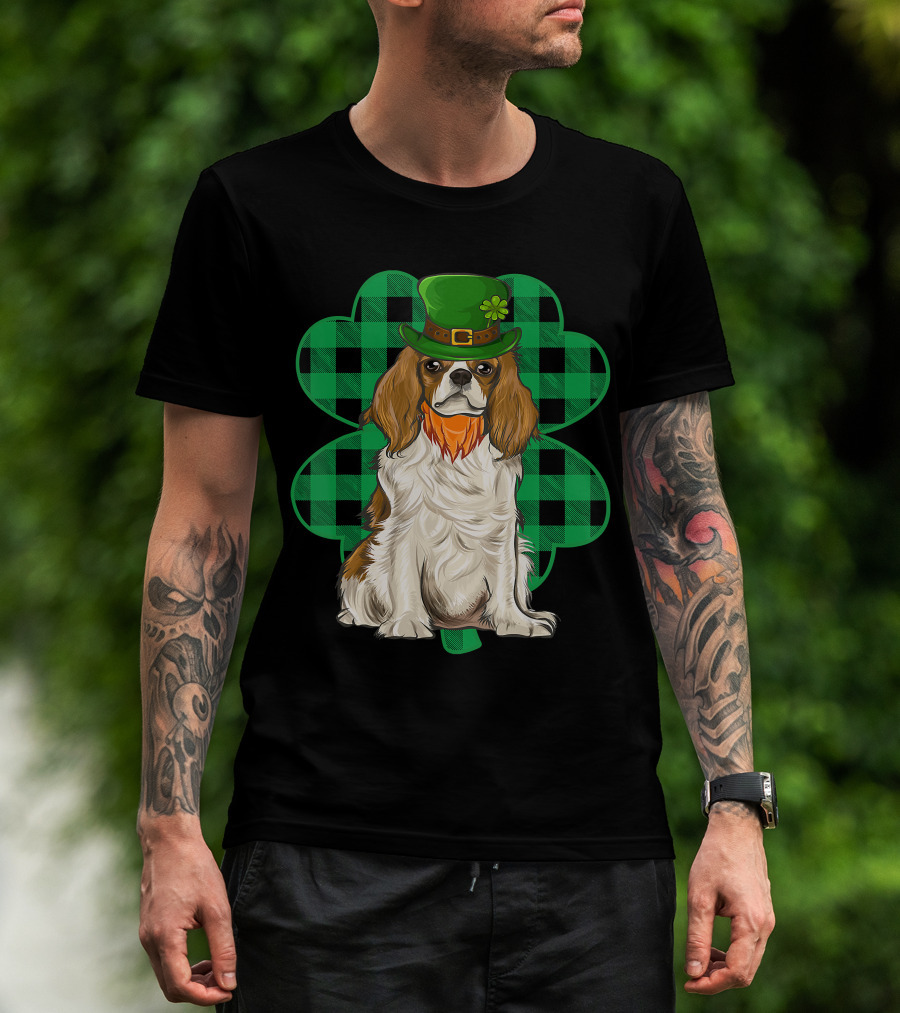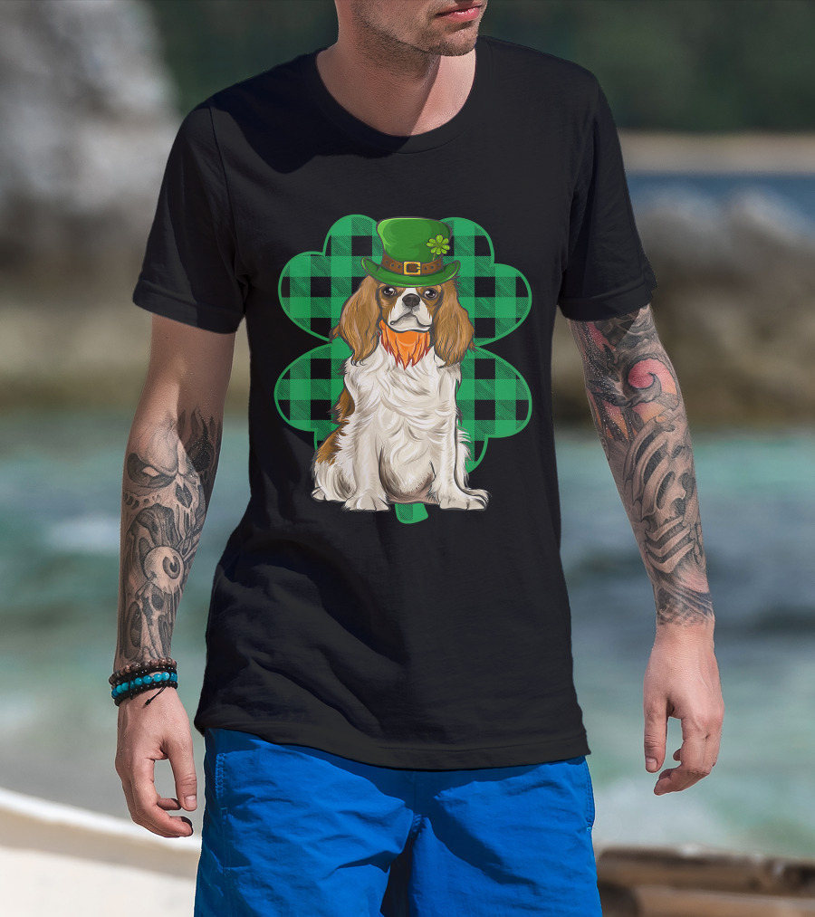 King Charles Spaniel Leprechaun With Shamrock Hat And Plaid Clover T-Shirt