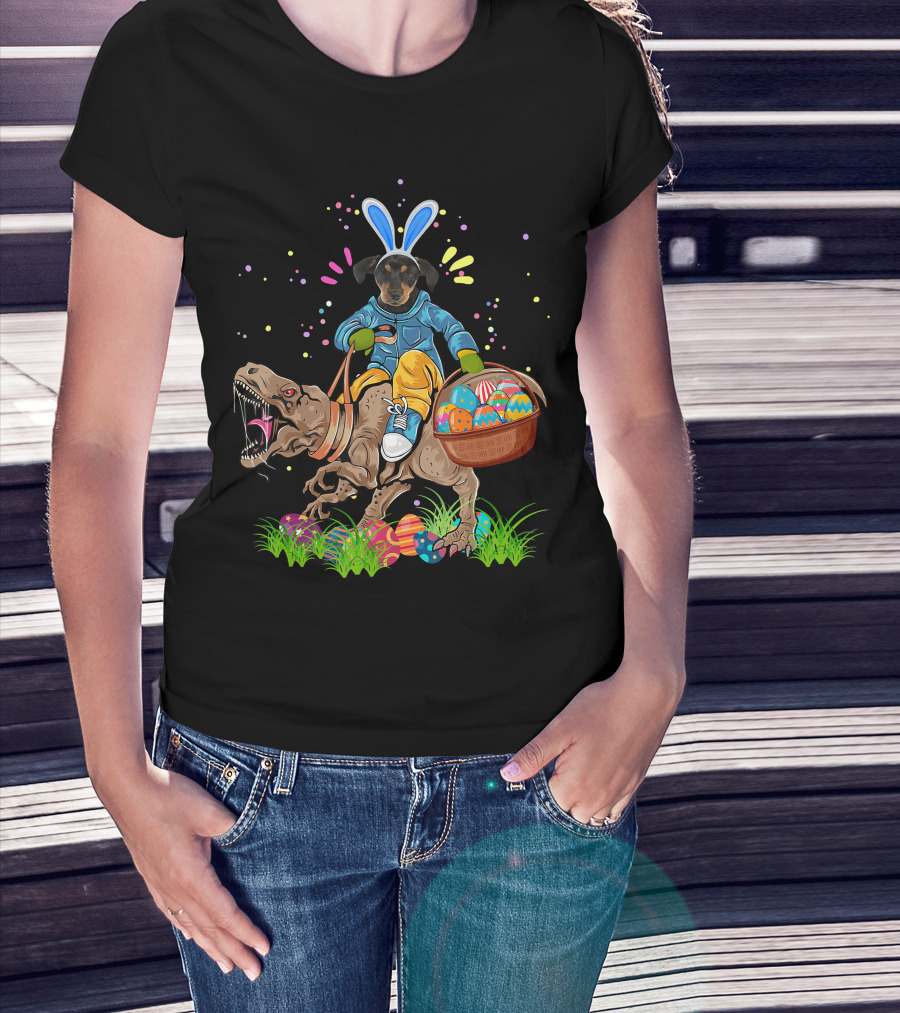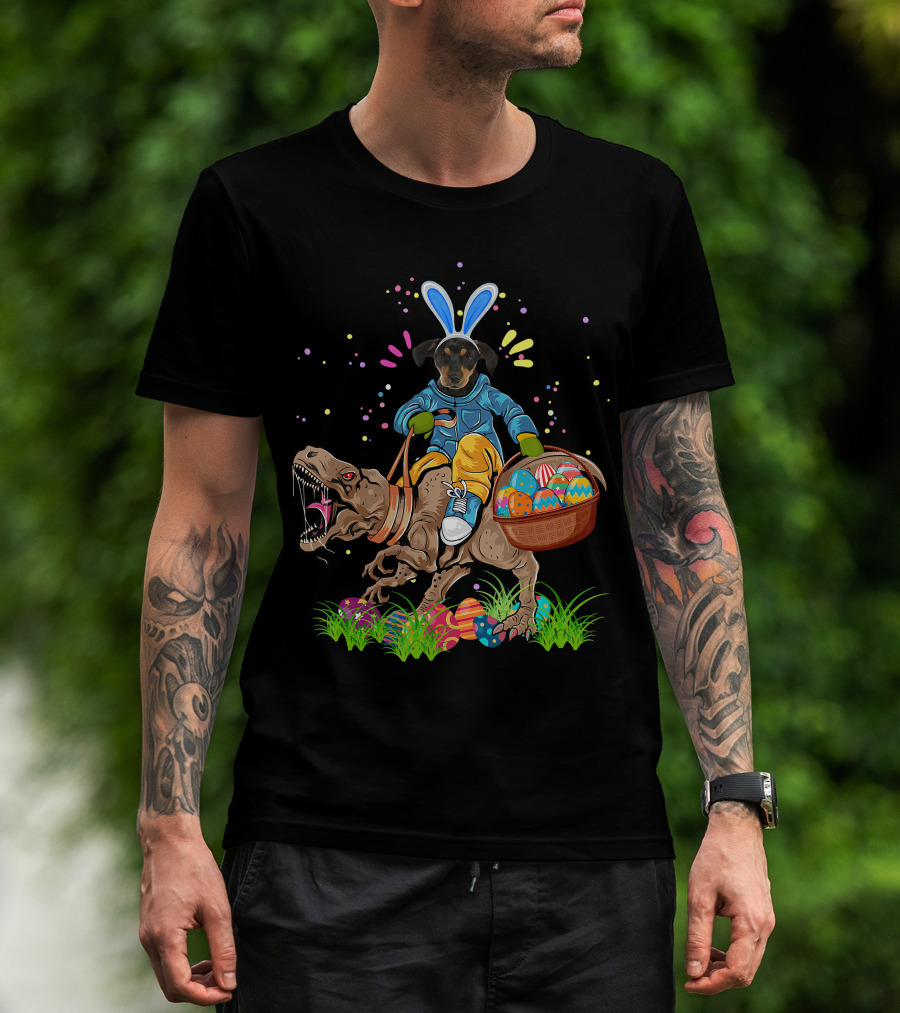 Bunny Rottweiler Dog Riding Rex Dinosaur With Easter Basket T-Shirt