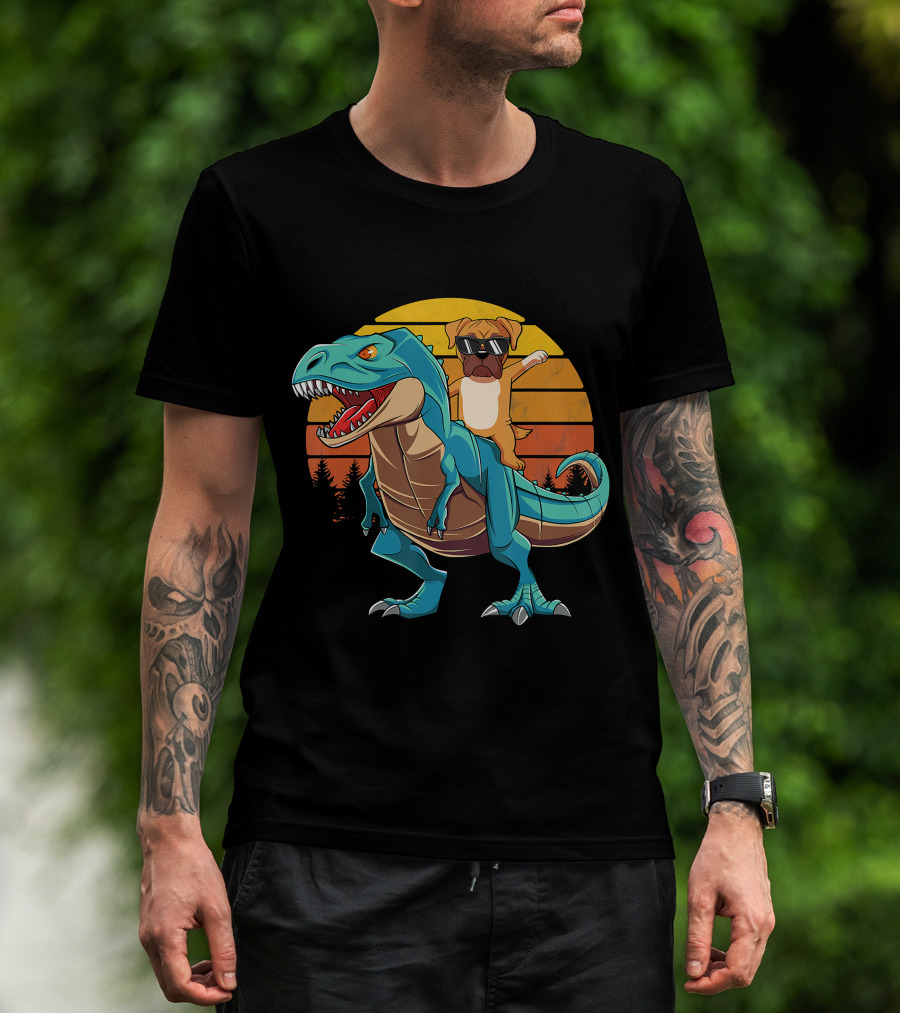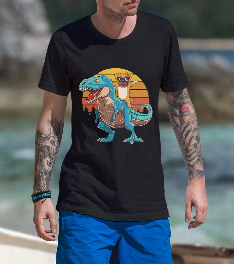 The Boxer Dog with Sunglasses Riding Blue T-Rex Against Sunset Background T-shirt is designed for everyday wear and a consistent fit. Fabric is pre-shrunk ring-spun cotton with durable stitching. See the size chart below for exact measurements.