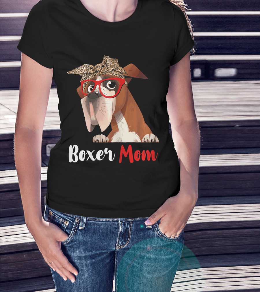 Boxer Mom With Red Glasses And Leopard Headband For Dog Lovers T-Shirt