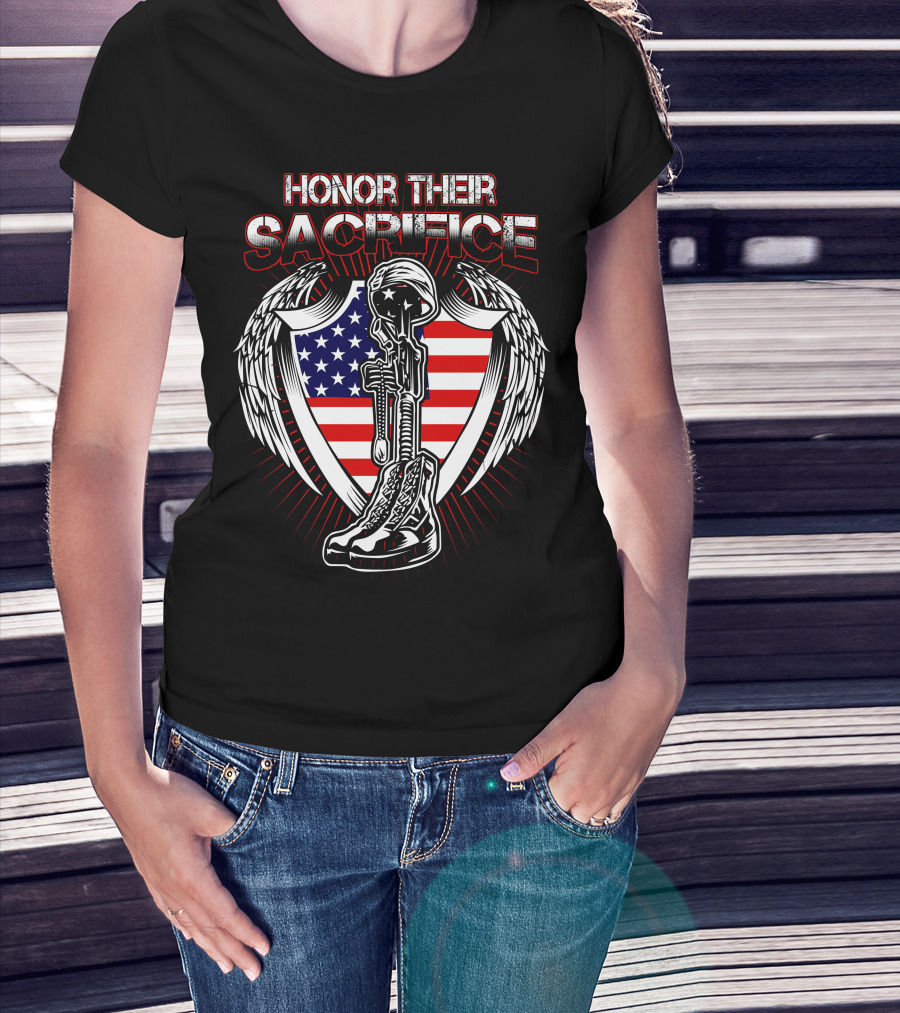 HONOR THEIR SACRIFICE American Flag Winged Soldier Memorial Helmet And Boots T-Shirt