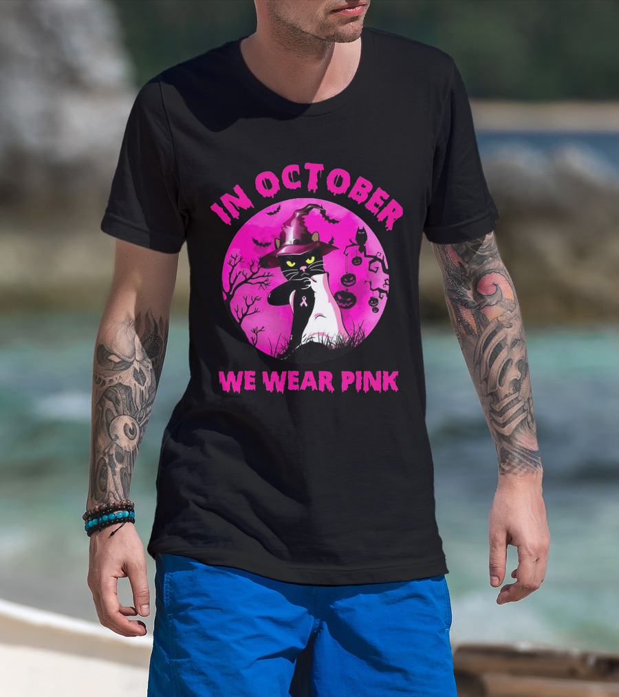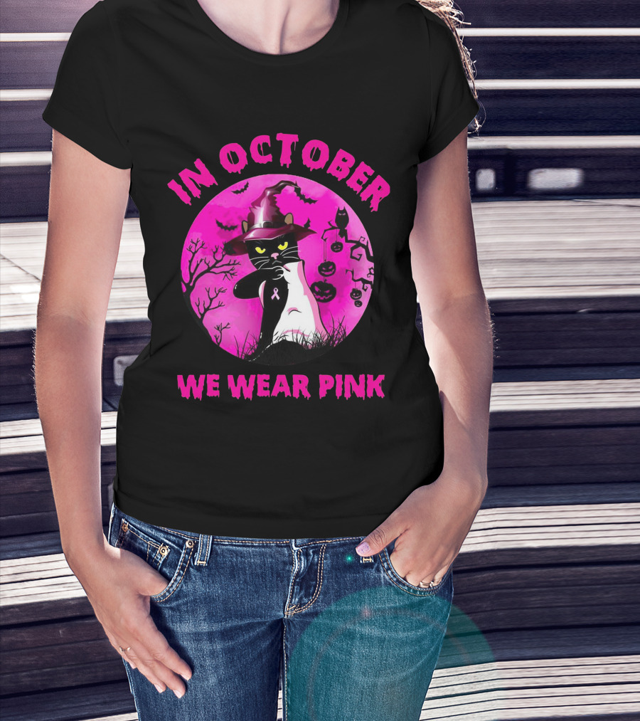 In October We Wear Pink Black Cat Witch Hat Pumpkin Breast Cancer Awareness T-Shirt